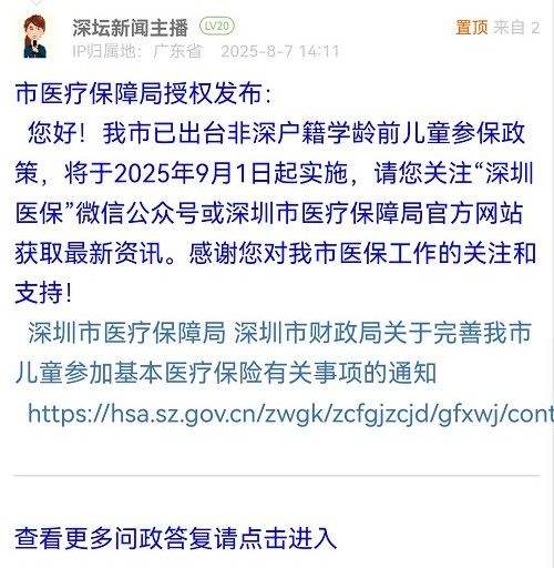 您好!我市已出臺非深戶籍學(xué)齡前兒童參保政策,將于2025年9月1日起實施,請您關(guān)注“深圳醫(yī)?!蔽⑿殴娞柣蛏钲谑嗅t(yī)療保障局官方網(wǎng)站獲取最新資訊。感謝您對我市醫(yī)保工作的關(guān)注和支持!