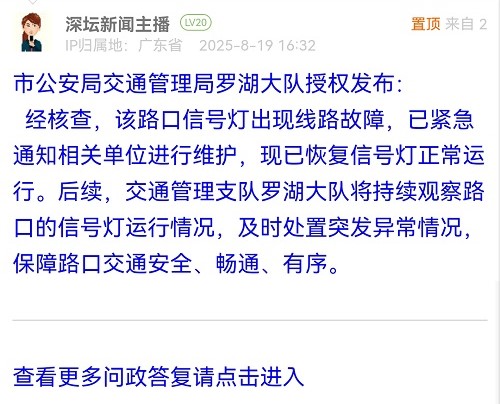 經(jīng)核查,該路口信號燈出現(xiàn)線路故障,已緊急通知相關(guān)單位進(jìn)行維護(hù),現(xiàn)已恢復(fù)信號燈正常運(yùn)行。后續(xù),交通管理支隊羅湖大隊將持續(xù)觀察路口的信號燈運(yùn)行情況,及時處置突發(fā)異常情況,保障路口交通安全、暢通、有序。