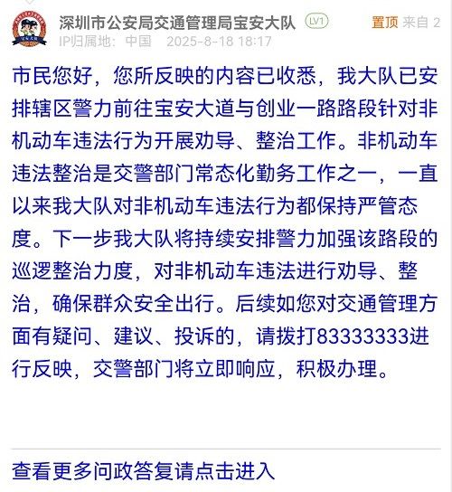 市民您好,您所反映的內(nèi)容已收悉,我大隊已安排轄區(qū)警力前往寶安大道與創(chuàng)業(yè)一路路段針對非機(jī)動車違法行為開展勸導(dǎo)、整治工作。非機(jī)動車違法整治是交警部門常態(tài)化勤務(wù)工作之一,一直以來我大隊對非機(jī)動車違法行為都保持嚴(yán)管態(tài)度。下一步我大隊將持續(xù)安排警力加強(qiáng)該路段的巡邏整治力度,對非機(jī)動車違法進(jìn)行勸導(dǎo)、整治,確保群眾安全出行。后續(xù)如您對交通管理方面有疑問、建議、投訴的,請撥打83333333進(jìn)行反映,交警部門將立即響應(yīng),積極辦理。