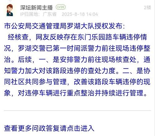 經(jīng)核查,網(wǎng)友反映存在東門樂園路車輛違停情況,羅湖交警已第一時間派警力前往現(xiàn)場違停整治。后續(xù),一、是安排警力前往現(xiàn)場核查處,通知警力加大對該路段違停的查處力度。二、是協(xié)同社區(qū)共同參與管理,改善該路段車輛違停的現(xiàn)象,對違停車輛進(jìn)行重點(diǎn)整治并持續(xù)進(jìn)行管理。