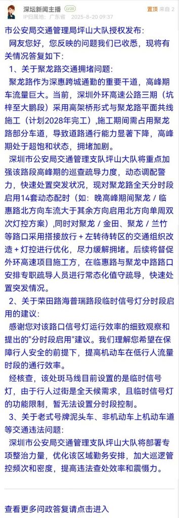 深圳市公安局交通管理支隊坪山大隊將重點(diǎn)加強(qiáng)該路段高峰期的巡查疏導(dǎo)力度,動態(tài)調(diào)配警力,快速處置突發(fā)狀況,現(xiàn)對聚龍路全天分時段啟用14套動態(tài)配時(如:晚高峰期間聚龍/臨惠路北方向車流大于其余方向啟用北方向單周雙次燈控方案),同時對聚龍/金田、聚龍/蘭竹等路口采用搭接放行+左轉(zhuǎn)待轉(zhuǎn)區(qū)的交通組織改造+燈控進(jìn)行優(yōu)化,盡力緩解擁堵。后續(xù)將督促外環(huán)高速項目施工方,在臨惠路與聚龍中路路口安排專職疏導(dǎo)人員進(jìn)行常態(tài)化值守疏導(dǎo),快速處置突發(fā)情況。