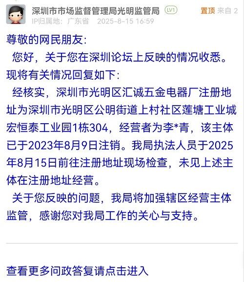 尊敬的網(wǎng)民朋友:您好,關(guān)于您在深圳論壇上反映的情況收悉。現(xiàn)將有關(guān)情況回復(fù)如下:經(jīng)核實(shí),深圳市光明區(qū)匯誠五金電器廠注冊地址為深圳市光明區(qū)公明街道上村社區(qū)蓮塘工業(yè)城宏恒泰工業(yè)園1棟304,經(jīng)營者為李*青,該主體已于2023年8月9日注銷。我局執(zhí)法人員于2025年8月15日前往注冊地址現(xiàn)場檢查,未見上述主體在注冊地址經(jīng)營。關(guān)于您反映的問題,我局將加強(qiáng)轄區(qū)經(jīng)營主體監(jiān)管,感謝您對我局工作的關(guān)心與支持。
