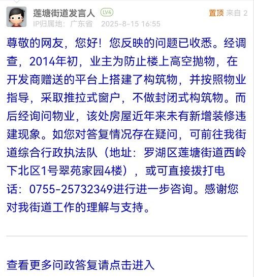 尊敬的網(wǎng)友,您好!您反映的問題已收悉。經(jīng)調(diào)查,2014年初,業(yè)主為防止樓上高空拋物,在開發(fā)商贈送的平臺上搭建了構(gòu)筑物,并按照物業(yè)指導(dǎo),采取推拉式窗戶,不做封閉式構(gòu)筑物。而后經(jīng)詢問物業(yè),該處房屋近年來未有新增裝修違建現(xiàn)象。如您對答復(fù)情況存在疑問,可前往我街道綜合行政執(zhí)法隊(地址:羅湖區(qū)蓮塘街道西嶺下北區(qū)1號翠苑家園4樓),或可直接撥打電話:0755-25732349進(jìn)行進(jìn)一步咨詢。感謝您對我街道工作的理解與支持。