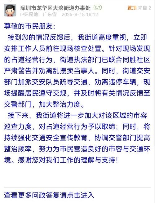 接下來,我街道將進(jìn)一步加大對該區(qū)域的市容巡查力度,對占道經(jīng)營行為予以取締;同時,將持續(xù)強(qiáng)化交通安全宣傳教育,協(xié)調(diào)交警部門提高整治頻率,努力為市民營造良好的市容與交通環(huán)境。感謝您對我們工作的理解與支持!