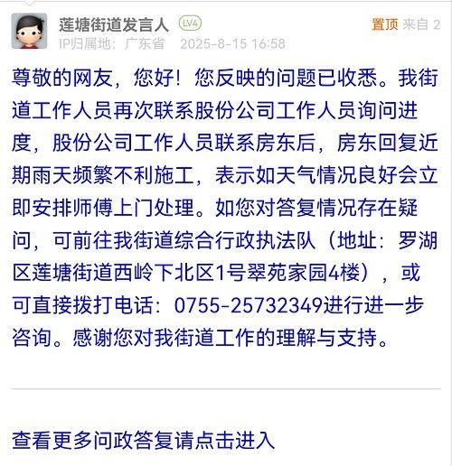 尊敬的網(wǎng)友,您好!您反映的問題已收悉。我街道工作人員再次聯(lián)系股份公司工作人員詢問進(jìn)度,股份公司工作人員聯(lián)系房東后,房東回復(fù)近期雨天頻繁不利施工,表示如天氣情況良好會立即安排師傅上門處理。如您對答復(fù)情況存在疑問,可前往我街道綜合行政執(zhí)法隊(地址:羅湖區(qū)蓮塘街道西嶺下北區(qū)1號翠苑家園4樓),或可直接撥打電話:0755-25732349進(jìn)行進(jìn)一步咨詢。感謝您對我街道工作的理解與支持。