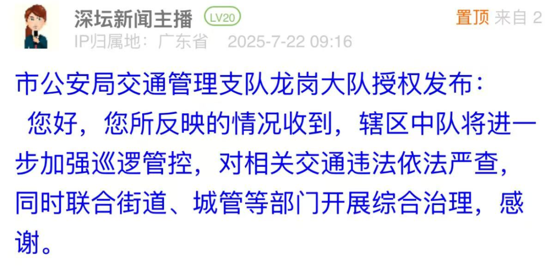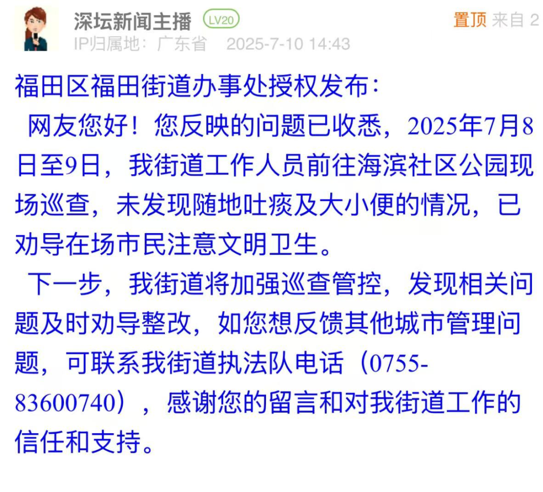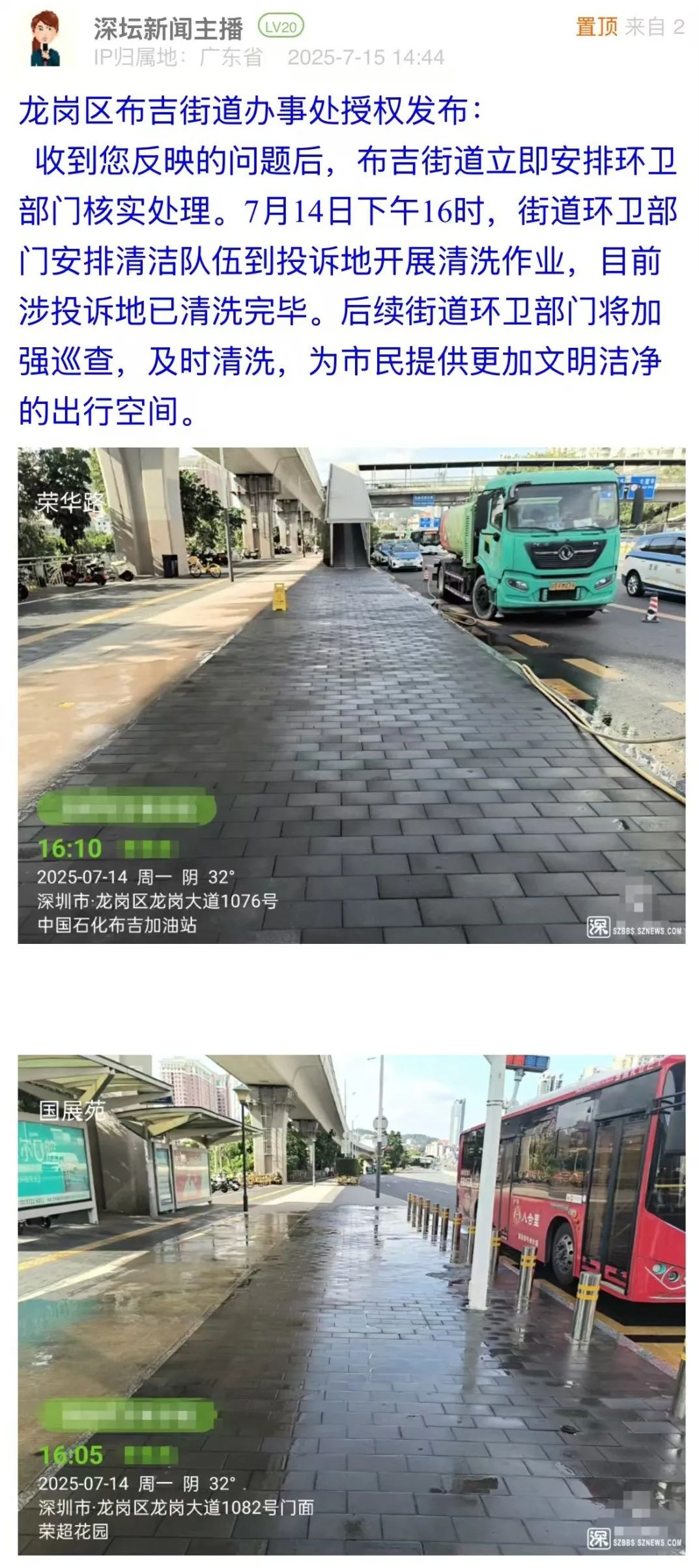 案例點(diǎn)評(píng):對(duì)于市民反映的路面油污問(wèn)題,布吉街道辦立即安排環(huán)衛(wèi)部門(mén)進(jìn)行清洗,并于第二日在問(wèn)政帖文下進(jìn)行回復(fù),以現(xiàn)場(chǎng)圖片展示路面清理效果,表示將加強(qiáng)后續(xù)巡查。此次處置展現(xiàn)了基層部門(mén)高效務(wù)實(shí)的問(wèn)題處理能力,為城市道路環(huán)境管理提供了快速響應(yīng)與長(zhǎng)效維護(hù)相結(jié)合的實(shí)踐范例,切實(shí)回應(yīng)了市民對(duì)潔凈環(huán)境的期待。