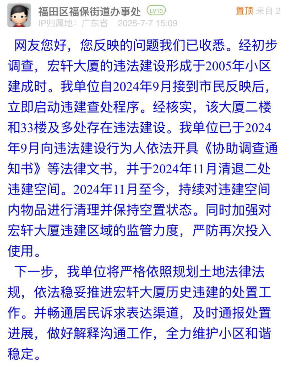 3、有市民反映福田區(qū)一大廈存在違建,希望有關(guān)部門(mén)關(guān)注處理
