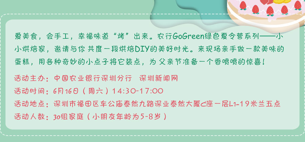 6月16日下午,中國農(nóng)業(yè)銀行深圳市分行聯(lián)合深圳新聞網(wǎng)開展了一場以親子體驗(yàn)為主題的Go Green綠色夏令營之“小小烘焙家”活動,讓孩子們通過DIY蛋糕培養(yǎng)動手能力和創(chuàng)造能力,為爸爸送上一份特別的父親節(jié)禮物。[詳細(xì)]